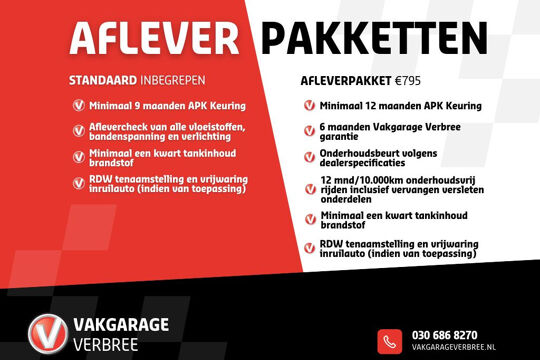 De prijs is inclusief minimaal 9 maanden APK, controle van vloeistoffen, verlichting en bandenspanning, een kwart tank brandstof en RDW tenaamstelling. Bij ons heeft u de keuze de aflevervoorwaarde uit te breiden, zie hiervoor het extra afleverpakket in de fotogalerij van deze auto.