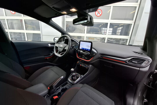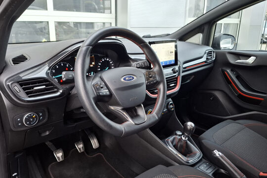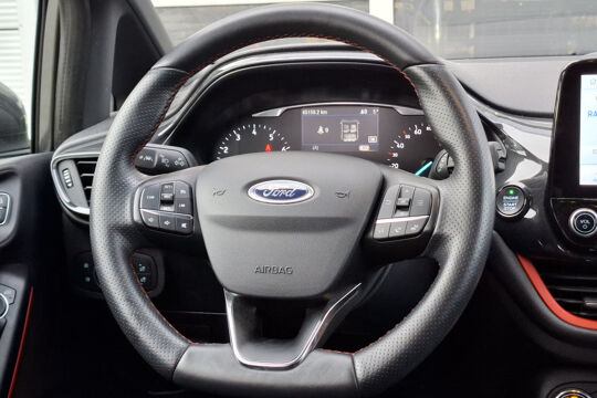 In de Ford Fiesta heeft uw veiligheid en die van uw omgeving prioriteit. Wat deze auto ook kan, is lezen. Hij 'leest' voor u de verkeersborden tijdens de rit en attendeert u erop door ze op het dashboard te projecteren. Het Lane-keeping systeem zorgt dat u mooi binnen de lijntjes blijft. Ongemerkt buiten de rijstrook komen is er niet meer bij. Vermoeid achter het stuur zitten vergroot de kans op een ongeval. Vermoeidheidsherkenning waarschuwt tijdig als u aan een rustpauze toe bent. In deze Ford vinden we verder een hill hold functie, brake assist en bandenspanningcontrolesysteem.