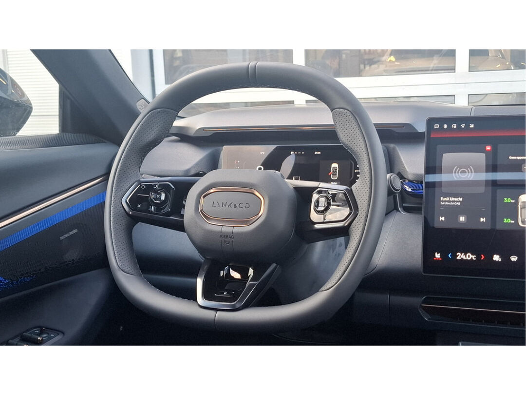 Deze Lynk & Co biedt u niet alleen comfort en rijplezier, maar ook veiligheid. Actieve veiligheidssystemen houden voor u de weg in de gaten en reageren op onvoorziene situaties voordat u dat kunt. Verkeersbord-detectie herkent verkeersborden en toont deze op het instrumentarium van de auto. Het Lane-keeping systeem garandeert dat u zich niet onverhoeds buiten de lijnen van de rijstrook begeeft. Kop-staartbotsingen vormen een belangrijk deel van de meest voorkomende aanrijdingen. De forward collision warning van deze auto voorkomt zulke botsingen geheel of reduceert de ernst van de schade aanzienlijk. In deze Lynk & Co vinden we verder een dodehoekdetectie, hill hold functie, brake assist, vermoeidheidsherkenning en bandenspanningcontrolesysteem.